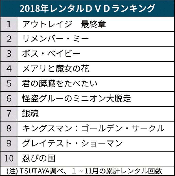日経mj على تويتر 9日のmj tsutayaがまとめた2018年の年間レンタルランキングは dvdが北野武監督の アウトレイジ最終章 でした cdは 米津玄師 が lemon でcdシングル首位に立つなど ランキングを席巻しました